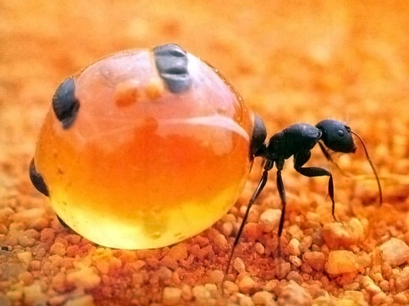 Miel de hormiga melíferaEste tipo de néctar es almacenado por las hormigas en su abdomen, hasta que se hinchan de forma desproporcionada y crean una especie de odre o depósito. La hormiga melífera se encuentra en las regiones secas y cálidas del planeta, especialmente en México. La miel de hormiga es ligeramente más amarga pero sus sabor también se considera delicioso y comparte muchas de sus propiedades medicinales.